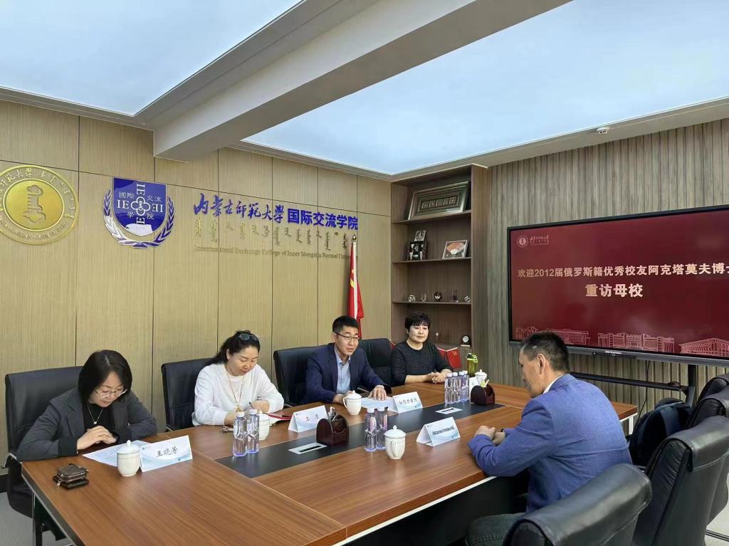 5月23日上午,受BV伟德中国官方网站邀请,伟德官网2012届科学技术史专业俄罗斯籍优秀毕业生校友阿克塔莫夫(Aktamov Innokentii)博士回母校交流,学院副书记、副院长白图力古尔老师,留学生管理科科长三月老师,教务科研办公室主任王晓芳老师,对外汉语教研室主任徐剑老师出席了此次活动。