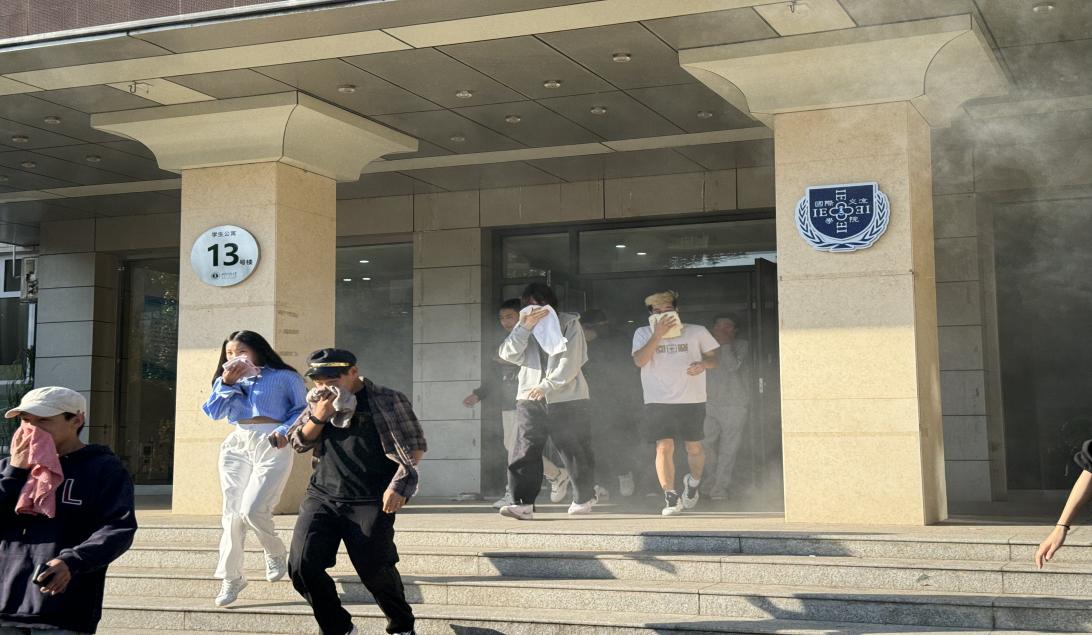 本次安全教育主题活动分为三个部分。首先是应急逃生演练。在模拟火灾的浓烟扩散、消防警报响起之后,同学们在消防引导员的引导下按照事先学习的正确逃生姿势有序从宿舍楼安全出口逃生。