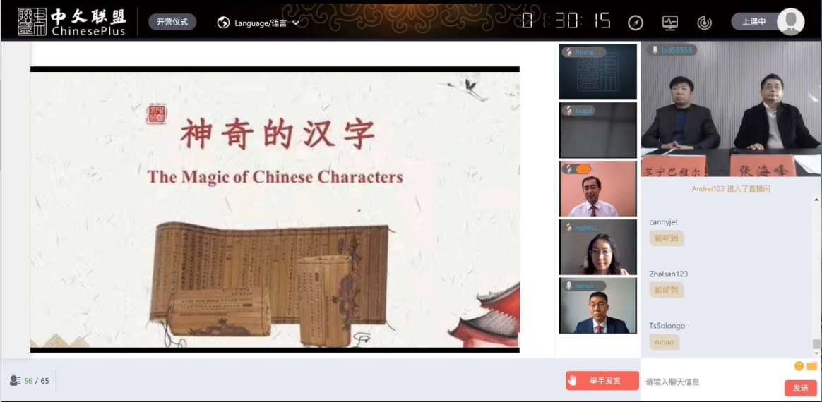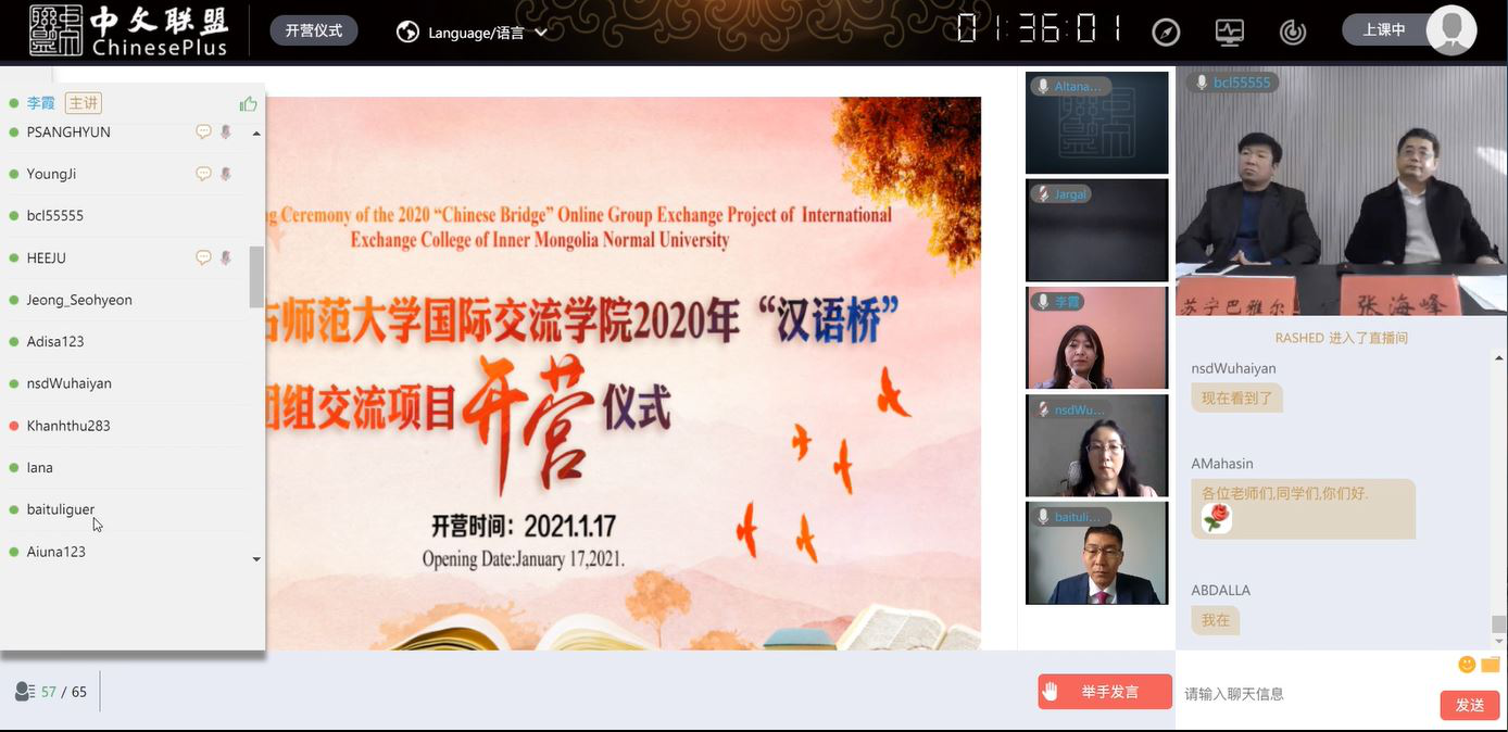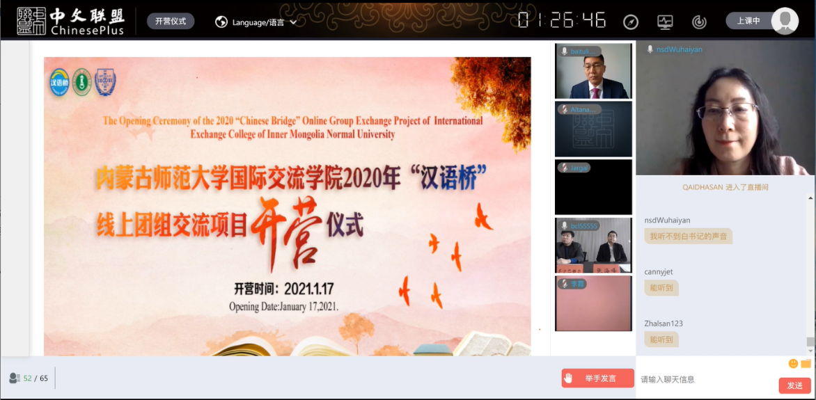 2021年1月17日下午,由教育部中外语言交流合作中心主办、BV伟德中国官方网站BV伟德中国官方网站承办的2020年“汉语桥”线上团组交流项目举行了线上开营仪式。BV伟德中国官方网站副校长张海峰、国际交流合作处副处长苏宁巴雅尔、BV伟德中国官方网站党总支书记屈原、院长武海燕、副书记副院长白图力古尔、“汉语桥”项目组全体教师和来自俄罗斯、蒙古、韩国、苏丹、南苏丹、也门等六个国家的65名学生相聚云端,在线上参加了开营仪式。仪式由BV伟德中国官方网站党总支副书记、副院长白图力古尔主持。
