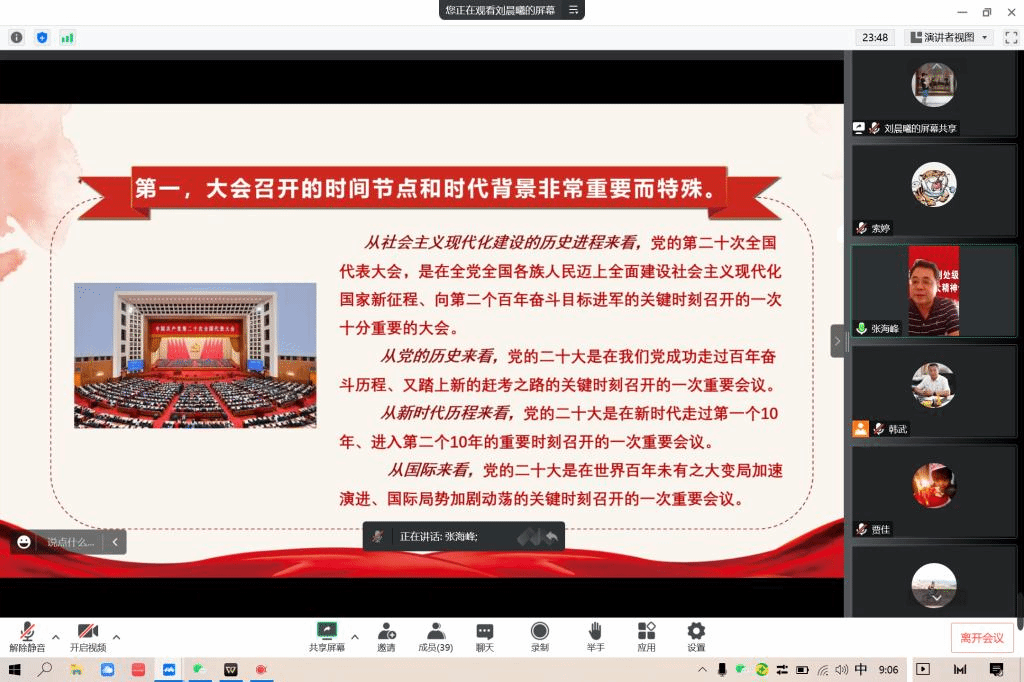 张海峰重点讲了三个方面:一、充分认识党的二十大的重大意义;二、全面准确学习领会党的二十大精神;三、全面学习、全面把握、全面落实,推动党的二十大精神在内蒙古落地生根、开花结果。