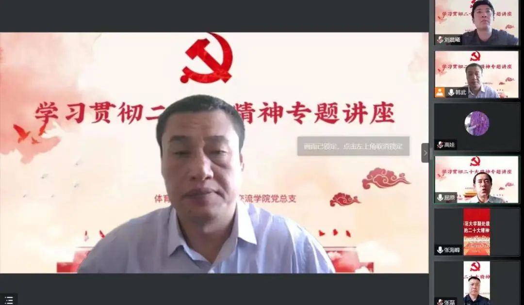 2023年1月10日上午,伟德官网党委副书记张海峰为BV伟德中国官方网站和体育学院作贯彻党的二十大精神专题讲座。参加讲座的有两学院党员及环节干部。讲座由体育学院党委书记韩武主持。